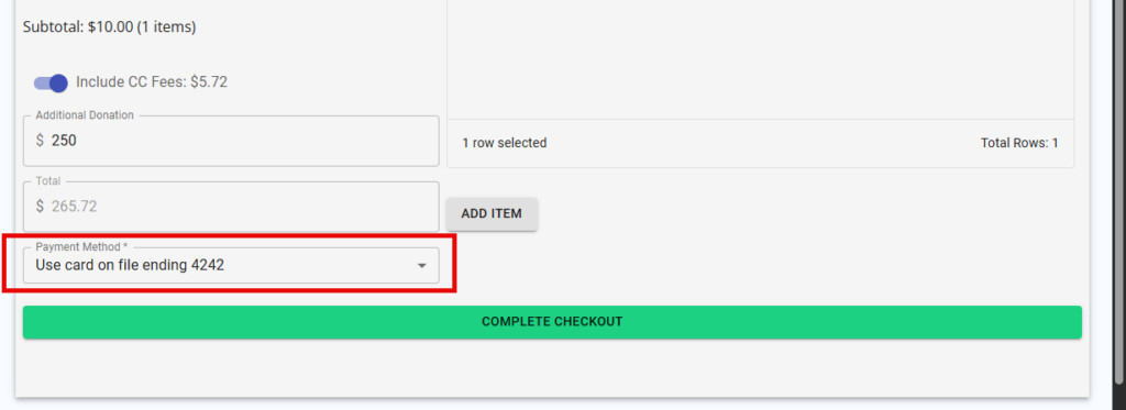If you are using Stripe as your payment processor and have set up your auction to require a card on file in order to bid or register, then you can use that card to process a checkout from the admin side directly. Go to the checkout screen as described above. At the bottom of the page, choose the Payment Method “Use card on file ending ####” and then complete the checkout.